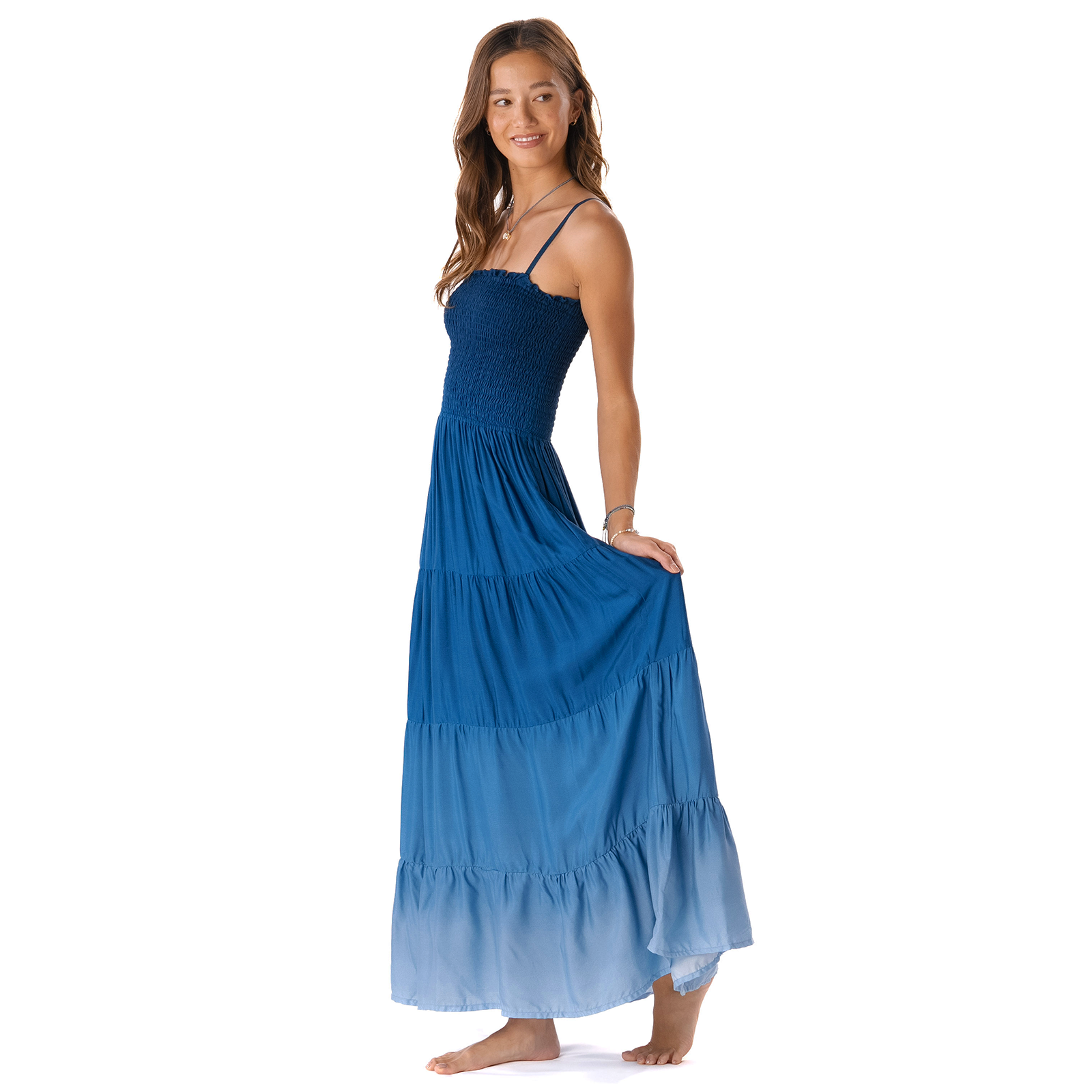 Get ready to twist and twirl in the Rayon Mai Tai Maxi Dress! This resort-ready piece effortlessly transitions from day to night. Featuring a fitted yet stretchy smocked bodice, adjustable straps and a flirty floor length, it's the easiest outfit you'll ever own. Perfect for travel, events and adventure, the Mai Tai Maxi Dress is your go-to for cheerful vibes and carefree style.