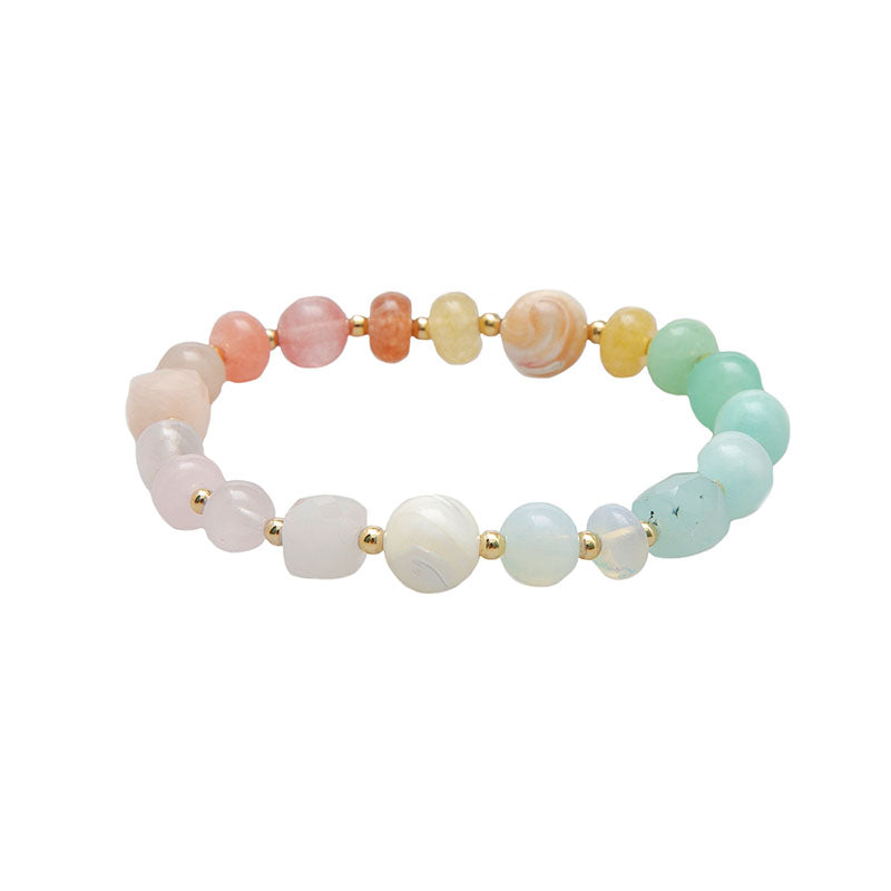 Introducing a stunning line of chunky statement bracelets designed for those who dare to stand out. Using real stones that are one-of-a-kind shapes and sizes, these bracelets are truly unique treasures. The Choose Happiness bracelet is a vibrant dose of pure joy, featuring a cheerful blend of Rose Quartz, Jade, Amazonite, and Mother of Pearl, instantly lifting your mood and radiating positive energy.