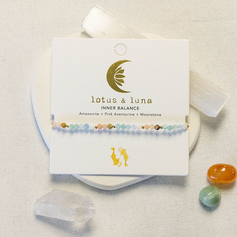 Find balance and harmony within, despite chaotic forces of the outside world. Amazonite, the ultimate stone of inner peace is joined by Moonstone and Pink Aventurine, known to inspire poweerful intuition, joy, and an open heart. Together, these stones stabilize mood and mindset to calm the nervous system and restore the spirit.
