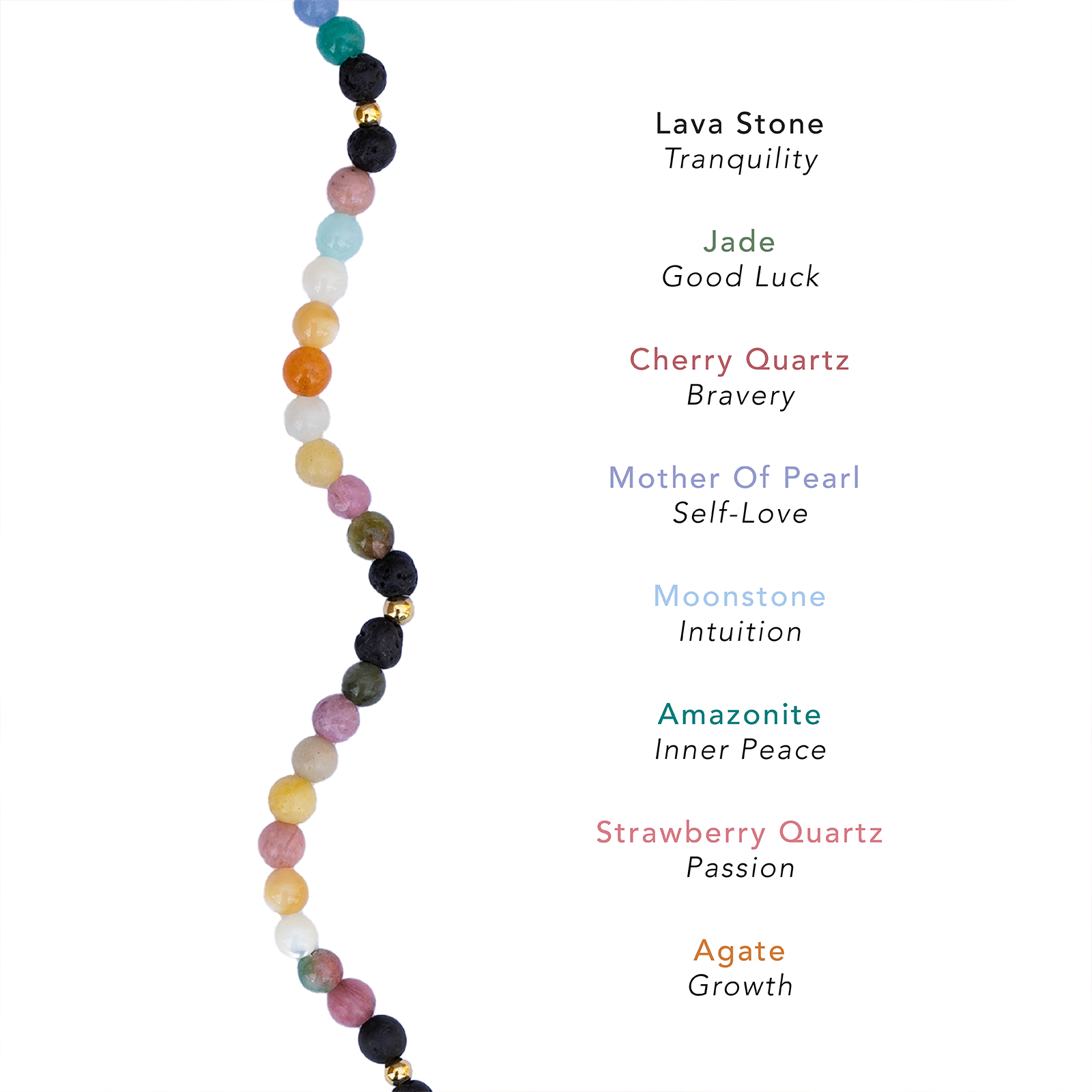 Featured Stones: Lava Stone, Jade, Amazonite, Cherry Quartz, Mother of Pearl, Moonstone, Strawberry Quartz, Agate