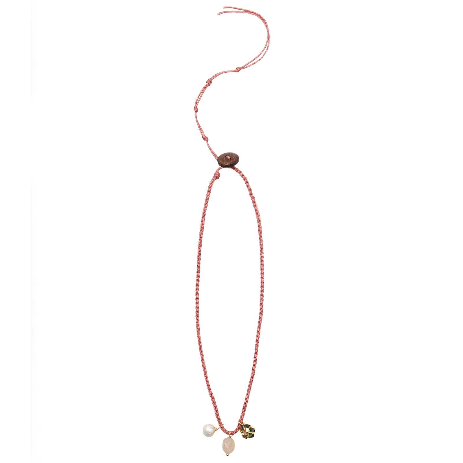 Materials: Pearl, Healing Stone, Gold Plated Charm, Nylon Cord